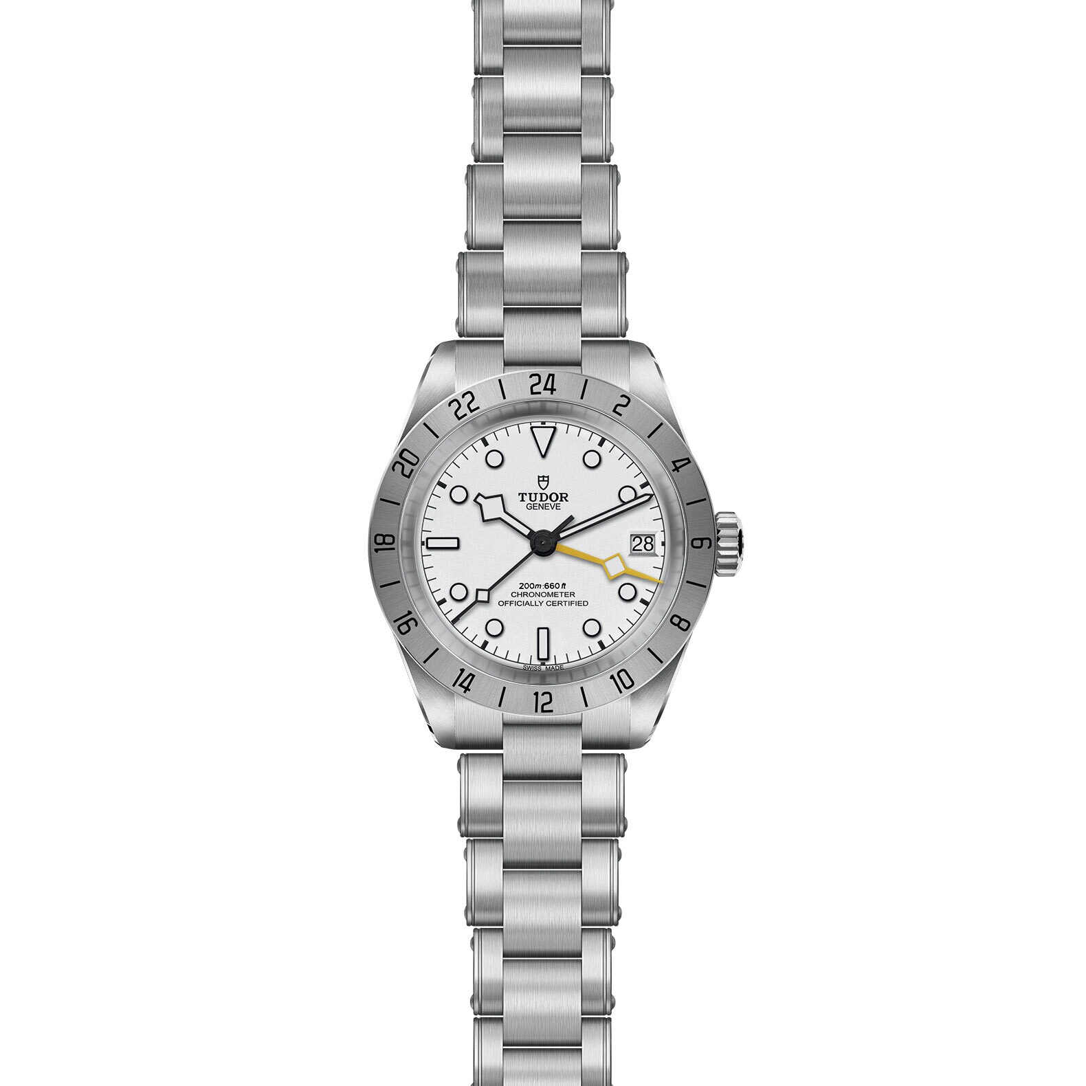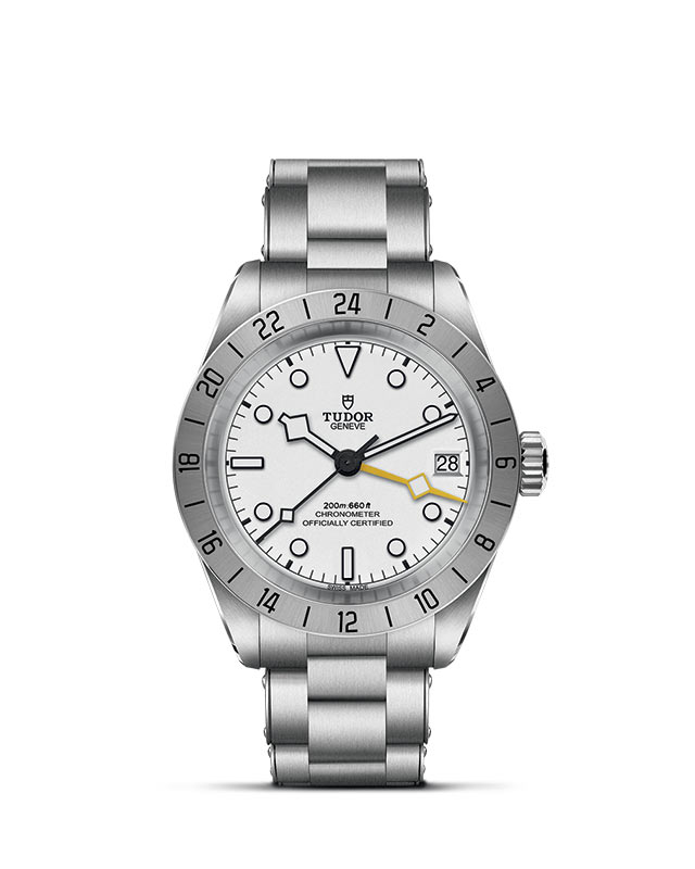 Black Bay Pro is an entirely new model with a dual time zone feature, a technical complication that establishes local time without losing sight of the time in another time zone. Compact, robust and sporty, this model boasts many unique aesthetic details and celebrates the spirit of the technical watches that TUDOR has produced for professionals throughout its history. Recognizable by its 24-hour graduated satin-brushed fixed bezel and its yellow 24-hour "Snowflake" hand, Black Bay Pro is powered by the TUDOR Manufacture Calibre MT5652 with built-in GMT function.