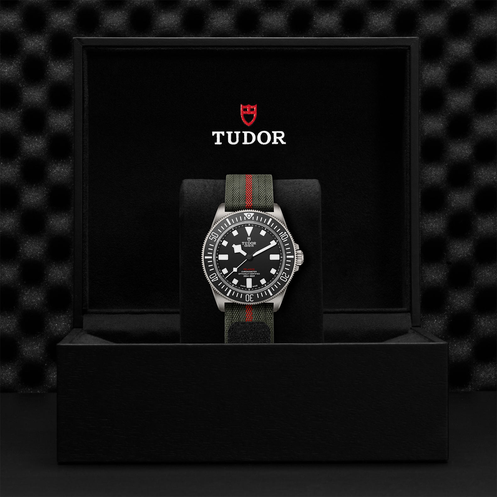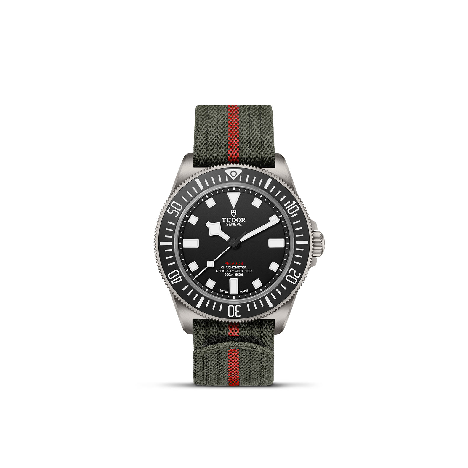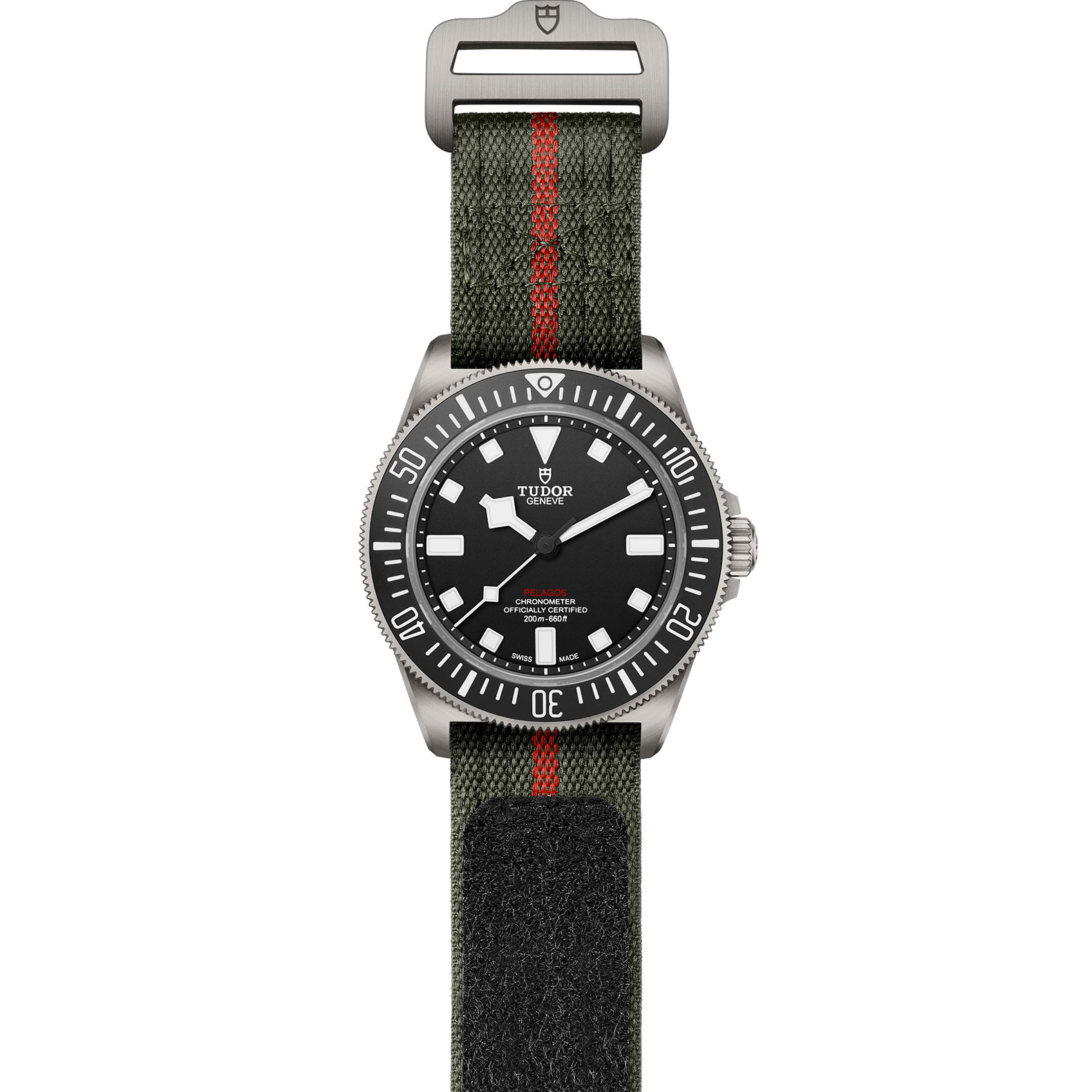 The Pelagos FXD model, where FXD refers to the extra robust fixed strap bars of the case, was developed in conjunction with the French Navy's combat swimmers. Waterproof to 200m (660 ft), it was designed for underwater navigation and is optimized for professional use. Also in the range is a model that pays tribute to the decades of TUDOR watches on the wrists of US Navy divers. Complete with fixed strap bars, a titanium case, a high-performance Manufacture Calibre and a unidirectional elapsed-time rotating bezel, it comes as the ultimate modern “Milsub” (short for Military Submariner) of yesteryear. Visually in line with a late ‘60s-era TUDOR Oyster Prince Submariner; it incorporates elements from the US military specifications for diving watches. In short, the FXD range is the product of TUDOR’s cooperation with two military organizations.